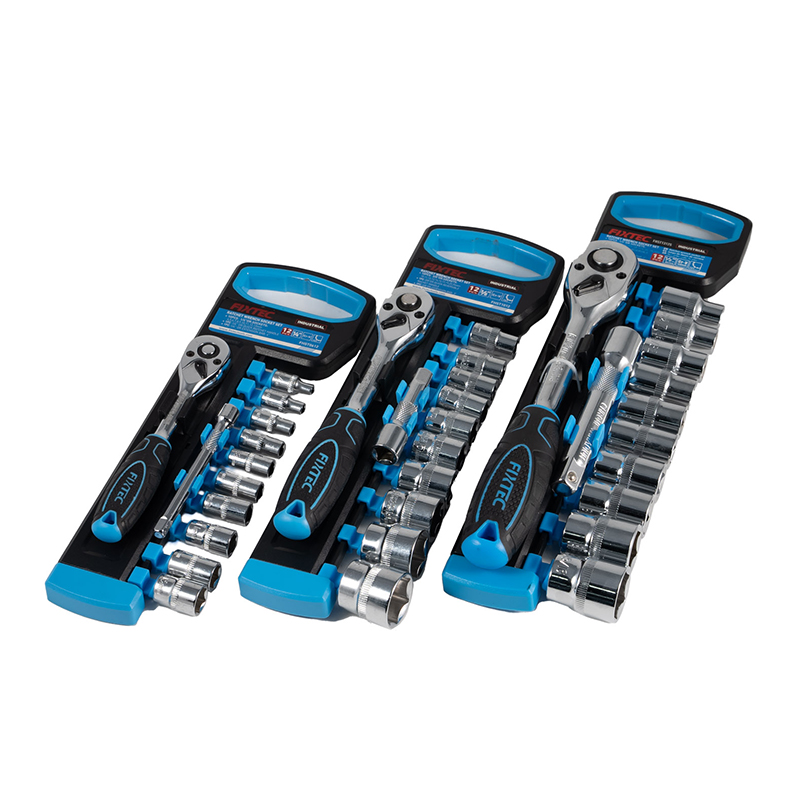 FHST1312 | 12pcs 1/2" ratchet handle with sockets set 1PC-1/2" quick release reversible ratchet handle 72Teeth CR-V 10pcs CR-V sockets:10,11,12,13,14,15,17,19,22,24MM 1pc CR-V extension bar 5" |